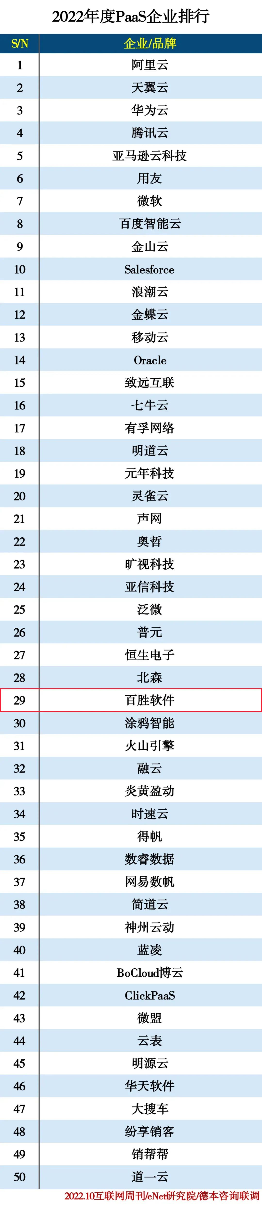 喜报丨百胜软件上榜“2022年度PasS企业排行”TOP榜单 近日,中国科学院《互联网周刊》联合德本咨询、eNet研究院共同发布了“2022年度PasS企业排行”榜单。百胜软件位列该榜单第29位,一同上榜的还有阿里云、华为云 ...