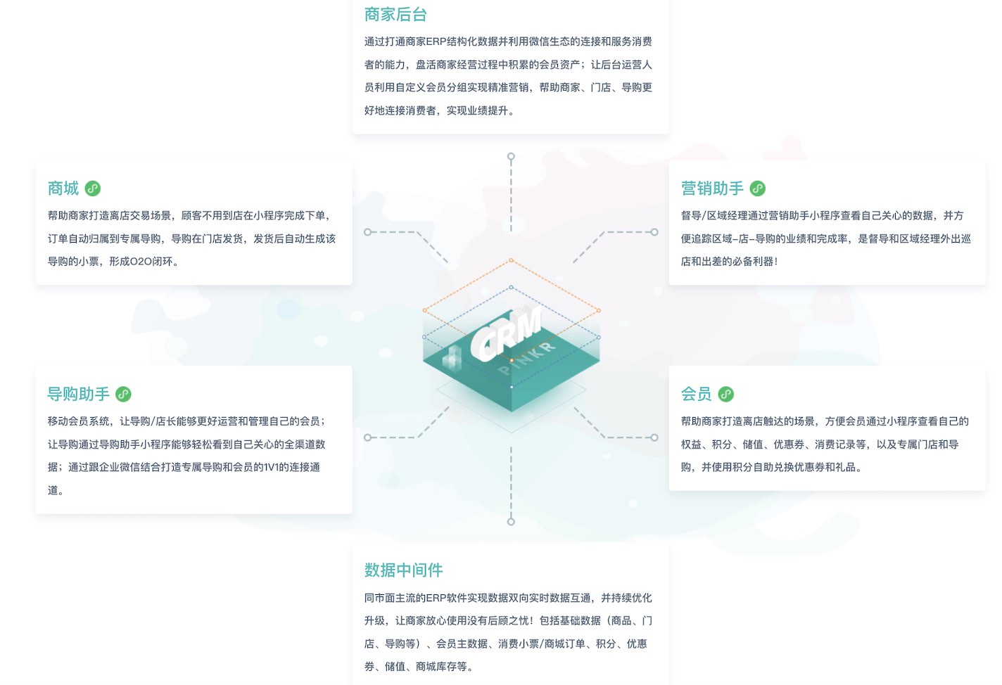 品氪CRM会员资产管理系统,包括小程序商城、导购助手、营销助手、会员中心,帮助企业全方位构建人、货、场的新关系,让零售企业更好识别、触达、洞察和服务消费者,建立以消费者为中心的企业核心竞争力 商家后台 通过打通商家ERP结构化数据并利用微信生态的连接和服务消费者的能力,盘活商家经营过程中积累的会员资产;让后台运营人员利用自定义会员分组实现精准营销,帮助商家、门店、导购更好地连接消费者,实现业绩提升。 商城 帮助商家打造离店交易场景,顾客不用到店在小程序完成下单,订单自动归属到专属导购,导购在门店发货,发货后自动生成该导购的小票,形成O2O闭环。 营销助手 督导/区域经理通过营销助手小程序查看自己关心的数据,并方便追踪区域-店-导购的业绩和完成率,是督导和区域经理外出巡店和出差的必备利器! 导购助手 移动会员系统,让导购/店长能够更好运营和管理自己的会员;让导购通过导购助手小程序能够轻松看到自己关心的全渠道数据;通过跟企业微信结合打造专属导购和会员的1V1的连接通道。 会员 帮助商家打造离店触达的场景,方便会员通过小程序查看自己的权益、积分、储值、优惠券、消费记录等,以及专属门店和导购,并使用积分自助兑换优惠券和礼品。 |